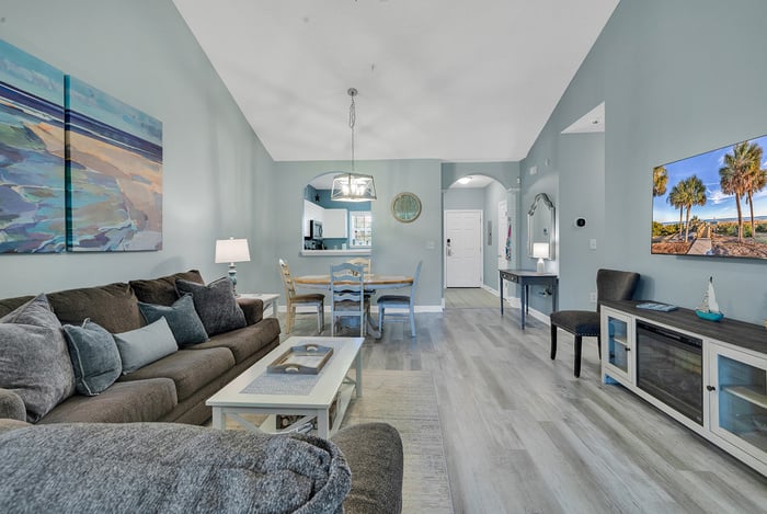 Spacious Living and Dining area with new 55" Smart TV. Screened Porch with Fairway Views